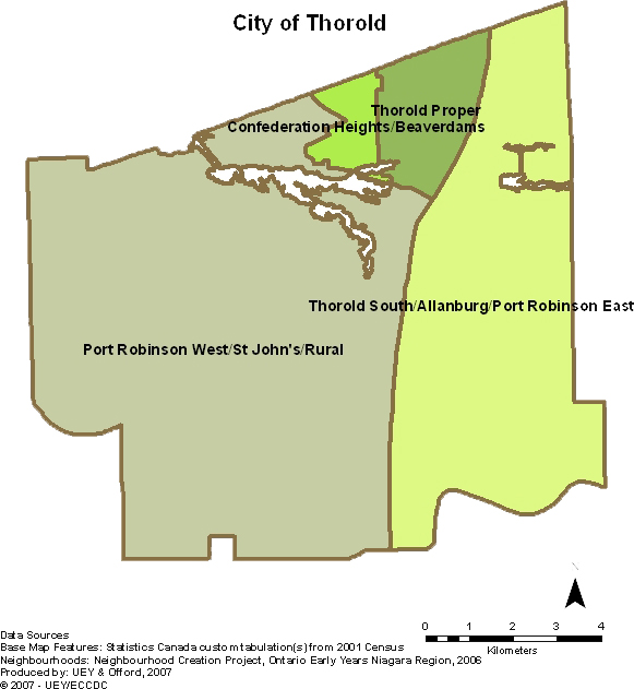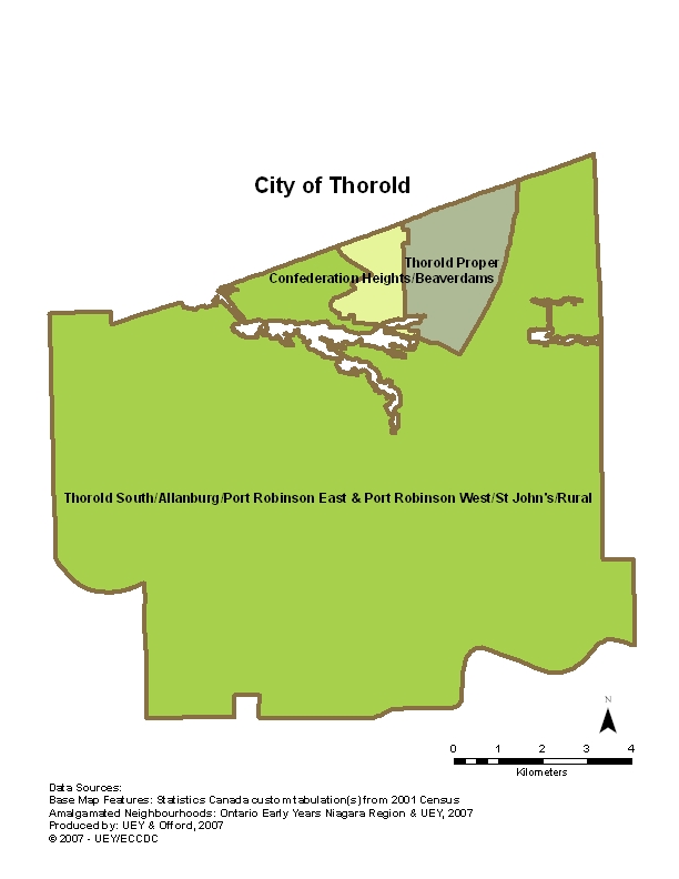 As a result, 2 of the 4 neighbourhoods in Thorold were amalgamated in order to report on EDI data and create a long-term workable solution. Neighbourhoods were amalgamated based on geographic proximity and similar socioeconomic conditions. This map will only be used for reporting EDI results. Maps with the original neighbourhoods will be used to report on socioeconomic conditions and community resources and their names will be included in all maps - out of respect and appreciation for the work and wisdom of the community champions who participated in the Neighbourhood Creation Project. Click here to see the amalgamated neighbourhoods in Thorold.
